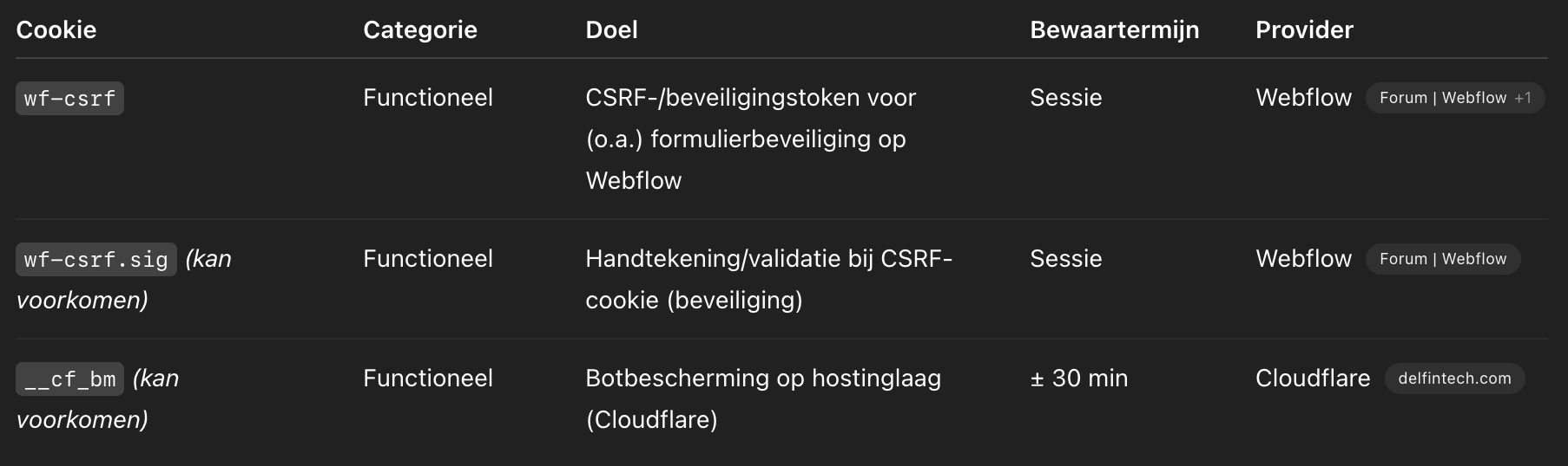 Deze cookies zijn nodig om de website veilig en correct te laten werken. Op Webflow-sites zijn dit vaak beveiligingscookies die o.a. form submissions beschermen tegen misbruik (CSRF-bescherming). (Forum | Webflow)